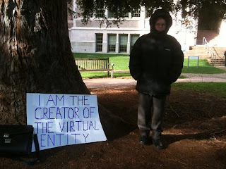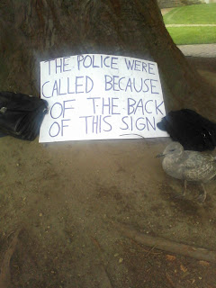 Then I hear something strange. Someone doing something different. A weird guy standing under a tree with a sign bearing cryptic messages. At first I think it's a joke. Maybe an advertisement or corporate stunt in a society where creativity is either exclusive to profit or illegal. Regardless, I'm curious.
