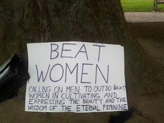 A few days later Kevin has a more controversial sign. "Beat Women". And in small print underneath: "calling on men to outdo (beat) women in cultivating the beauty and the wisdom of the eternal feminine". Basically a pro-women sign, but it would take a closer look to realize that. A guy walks up and takes the time to read the sign, but doesn't get it. He seems angry. "Why would you show a sign like this?" He asks.